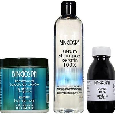 Intensywna kuracja BINGOSPA, której elementami są: 1. Szamponowe serum keratynowe 300 ml 2. Keratynowa kuracja do włosów ze spiruliną i L-cysteiną 250 g 3. Keratyna 100% 100 ml Surowiec kosmetyczny - posiada charakterystyczny, niezbyt przyjemny zapach. Kuracja polega na wykonaniu co drugi dzień, poniższych zabiegów wg schematu: Zabieg 1 → Zabieg 2 → Zabieg 1 → Zabieg 2 → Zabieg 1 → Zabieg 2 → Zabieg 1 Zabieg 1 Dwukrotnie myjemy włosy i skórę głowy "Szamponowym serum keratynowym". Na mokre włosy nakładamy "Keratynową kurację ze spiruliną i L-cysteiną", pozostawiamy na 10 minut i dokładnie spłukujemy wodą. Włosy wycieramy ręcznikiem i lekko podsuszamy suszarką. Za pomocą atomizera lub wacika kosmetycznego nakładamy "Keratynę 100%" i wmasowujemy w końcówki włosów. Dokończyć stylizację. Zabieg 2 Dwukrotnie myjemy włosy i skórę głowy "Szamponowym serum keratynowym". Za pomocą atomizera lub wacika kosmetycznego nakładamy "Keratynę 100%" i wmasowujemy w końcówki włosów. Dokończyć stylizację. Po przeprowadzeniu intensywnej kuracji należy powtarzać schemat do uzyskania długotrwałego efektu. Do stałej pielęgnacji wprowadzamy "Szamponowe serum keratynowe". "Keratynową kurację do włosów ze spiruliną i L-cysteiną" i "Keratynę 100%" należy stosować co trzecie mycie włosów i skóry głowy. //